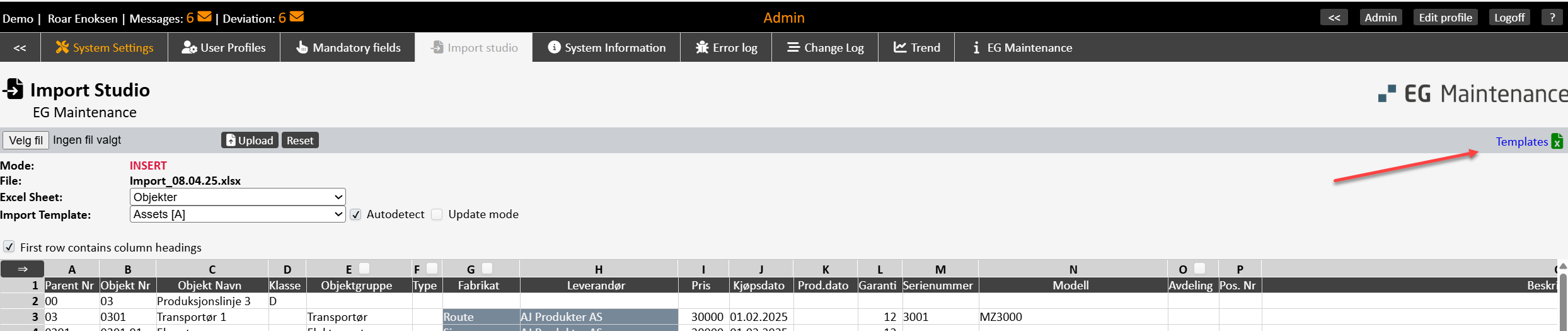 Import Excel file containing sheets for all available imports can be downloaded via the ‘Templates’ button.