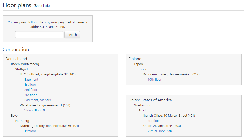 The floor plans is opened by clickin the building's floor name. The floor plan is opened to the same or external window depending what the user has selected at My settings page.
