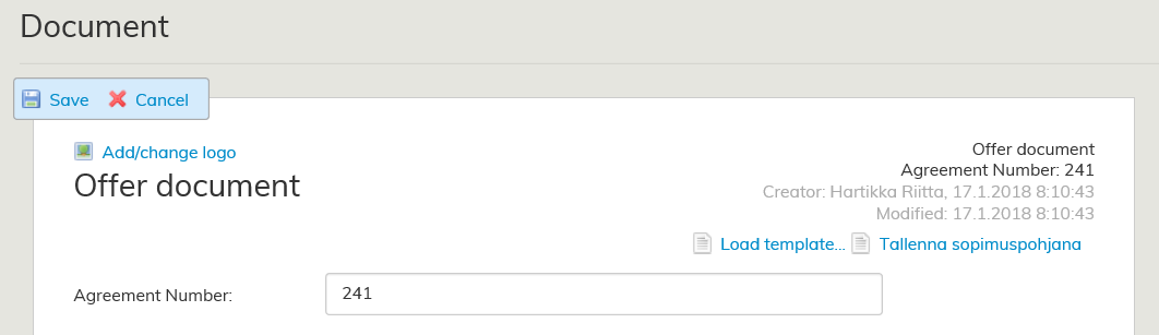 An offer form appears on the workspace for filling out the information used for the offer. For detailed instructions on how to fill out the form, see section Filling out the offer form.