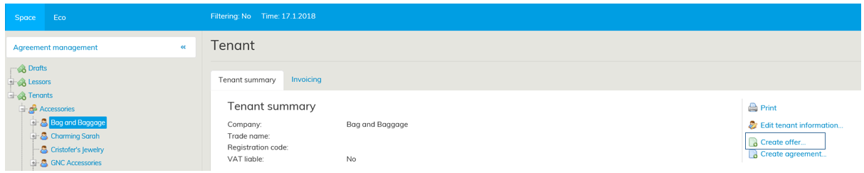 From the main menu, select Outrent and then Rental area management. From the tree-like list, select the rental area, for which you wish to create an offer. Then, click Create offer on the right of the workspace.
