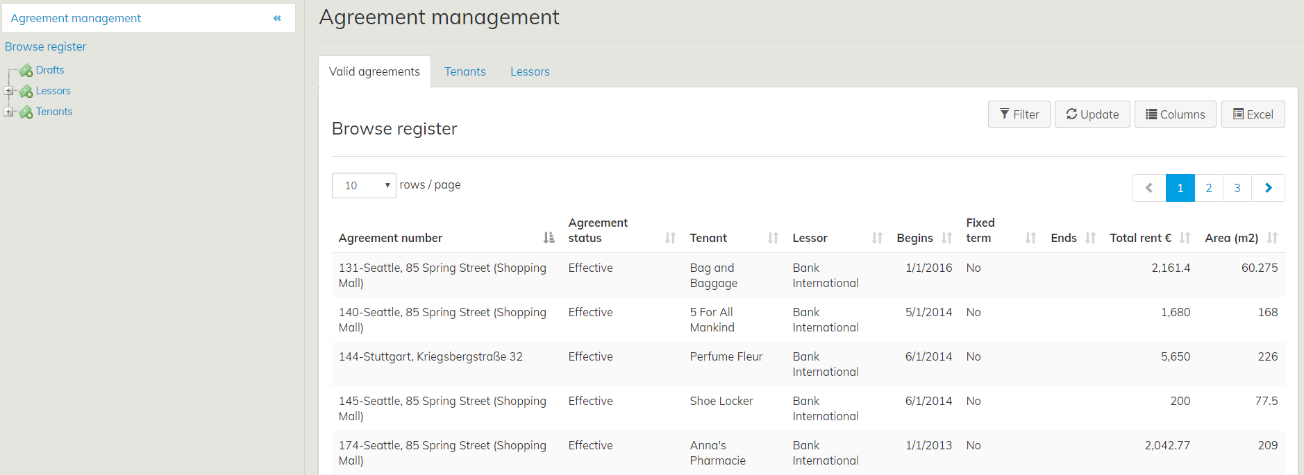 From the Agreement management view, you can review, edit and create lease agreements. Currently on-going agreements, as well as the draft agreements, are displayed in the Agreement management view.