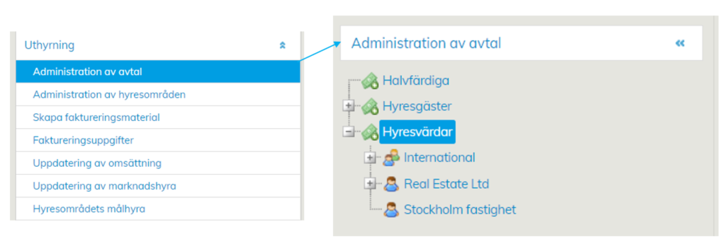 I trädet kan du bläddra bland hyresvärdar och hyresgäster samt båda parters hyresavtal. För administration av parterna finns en mer detaljerad instruktion i punkterna Administration av hyresgästs uppgifter och Administration av hyresvärds uppgifter.