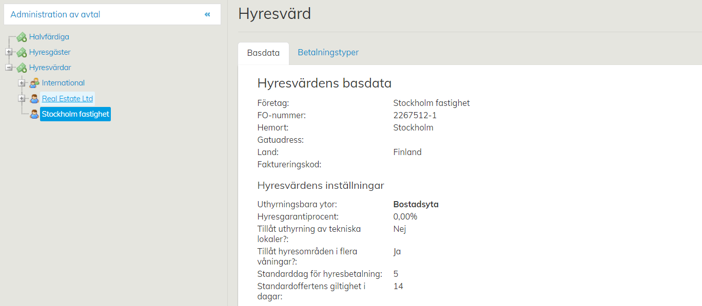 Här i demo-databasens Administration av avtal ser du att en hyresvärdsgrupp har skapats i Hyresvärdar, varav hyresvärdar för Värdefastigheter visas överst.