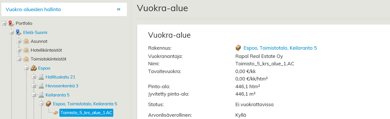 Avaa kyseessä olevan rakennuksen koontilomake Vuokra-alueiden hallinnasta