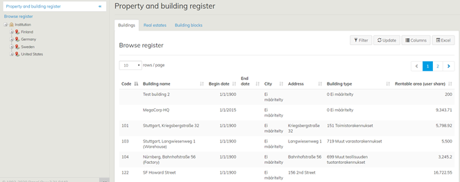 When you open the Property and building register, the ‘Browse register’ view is opened as default, but you can also browse the register in the old way by clicking on the location tree on the left.