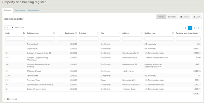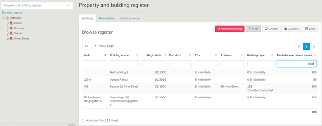 In the ‘Browse register’ view, you can filter the locations on the basis of start date, partial name, rentable area and so on. To activate the filter, click on the ‘Filter’ button.