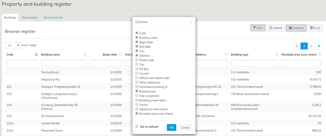 The ‘Browse register’ functionality is enabled for all customers in the most important registers in the system, including the Property and building register. If necessary, it can also be enabled in other Optimaze registers, including customer-specific registers. If you would like to use the functionality in another register or change the default settings, please contact Optimaze Support via the ‘Support’ button on the Moment top bar.