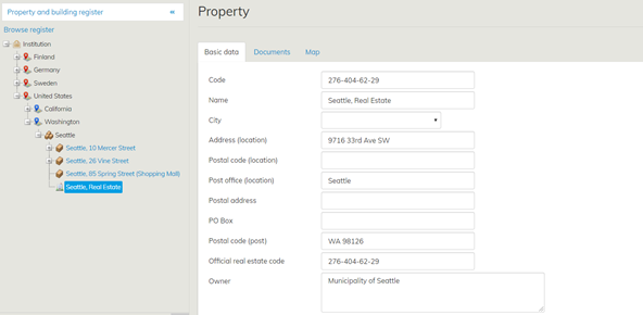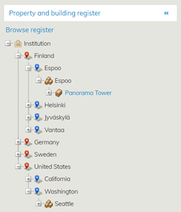 To view or edit information in the Property and building register, select the real estate or building (text in blue font) you want to view or edit from the location tree or navigation list.
