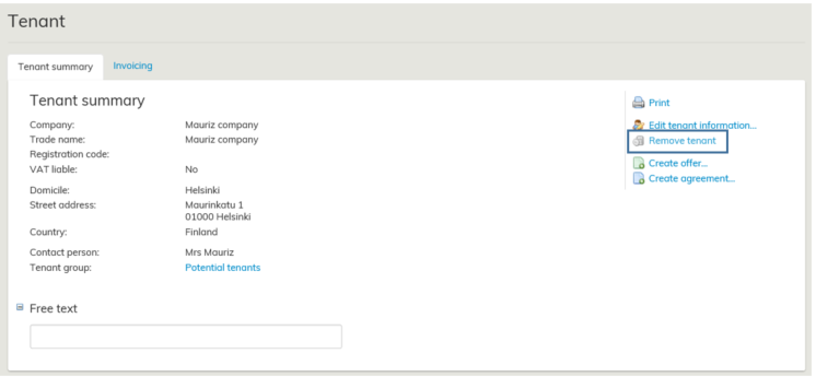 If it is possible to remove a tenant or a lessor, the option Remove tenant will appear on the right in the tenant and lessor summary page.