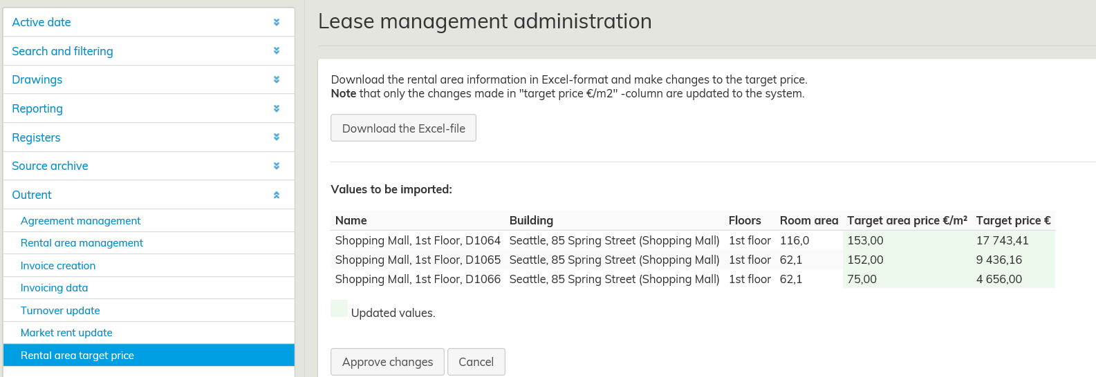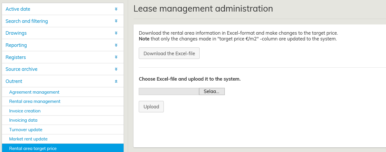 Ladda ned hyresområdenas uppgifter i Excel-format och gör nödvändiga ändringar i uppgifterna i kolumnen Målhyra €/m².