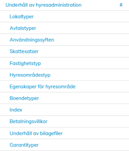 Under rubriken Underhåll av hyresadministration har de underhållsåtgärder för uppgifterna som påverkar hyresavtalen samlats.