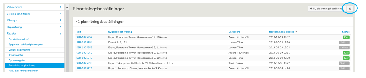 De gjorda beställningarna av planritning och funktionen för skapa ny beställning finns under punkten Register i huvudmenyn.