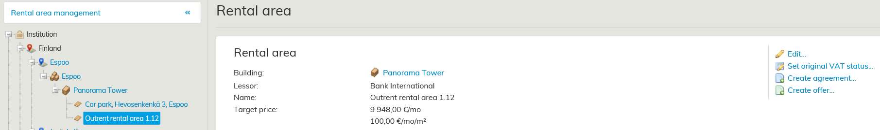 From the tree-like list, select the rental area, for which you wish to create an inrent agreement. Then, click Create draft agreement on the right of the workspace.
