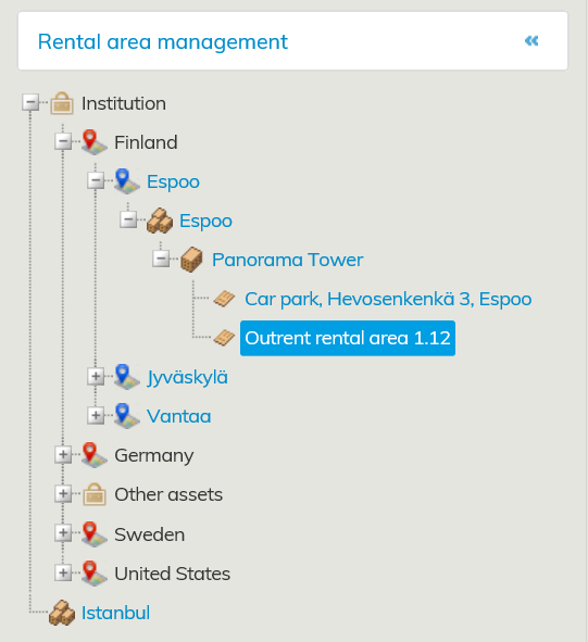 I vyn Administration av hyresområden är hyresavtalen ordnade enligt fastighetshierarkin.