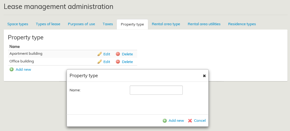 Vyn Administration av val finns här: Administration – Underhåll av hyresadministration – Fastighetstyp. Nya värden lägger du till genom att klicka på Lägg till ny.