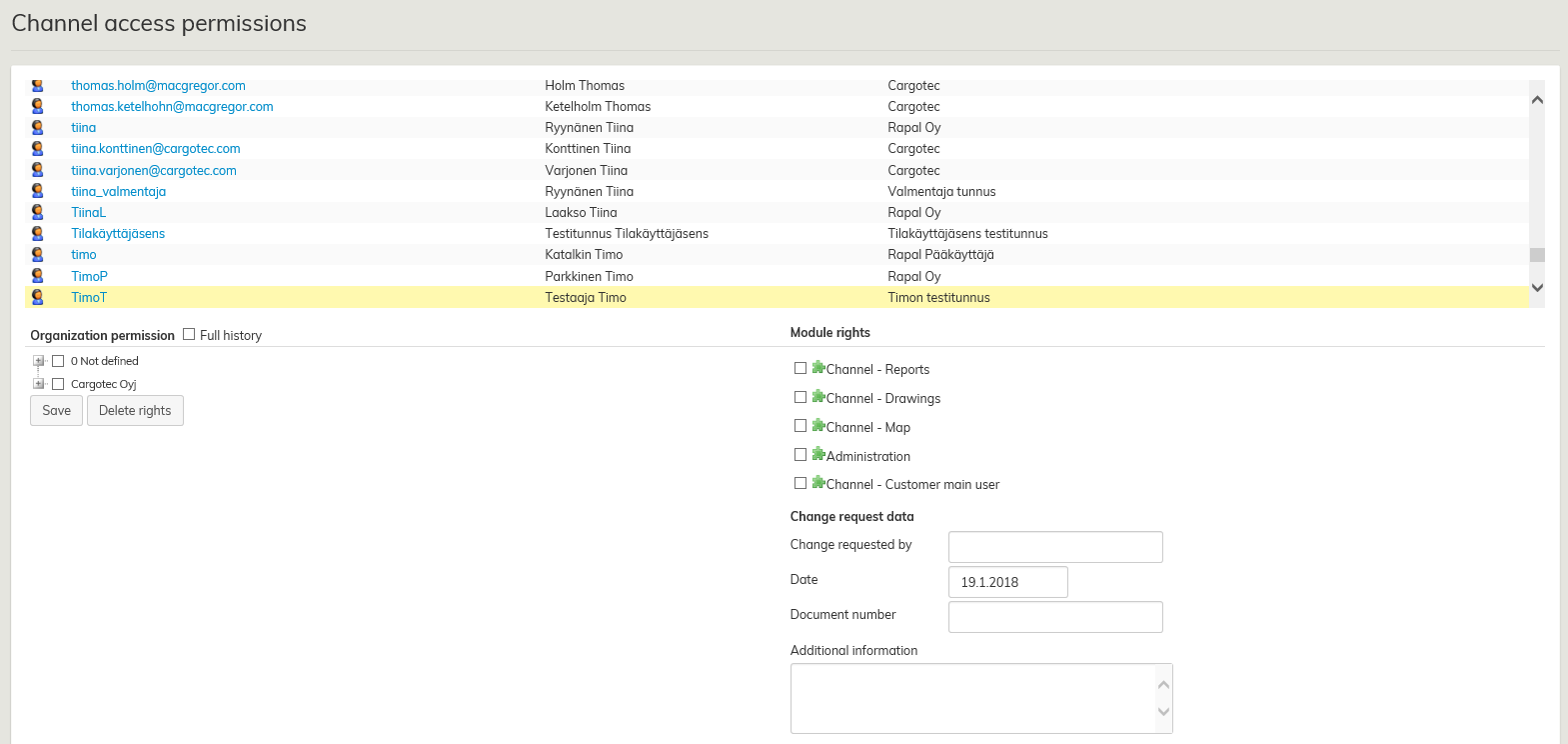 Administrationen av kanalbehörigheter kräver naturligtvis dessutom att organisationen har Kanalen i bruk. Genom att välja Administration av kanalbehörigheter öppnas en lista över användare i arbetsfönstret