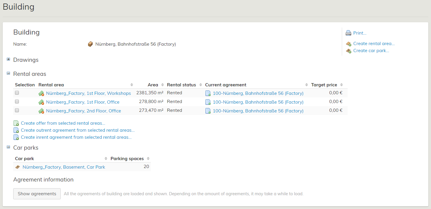 På samlingsblanketten för byggnad visas alla hyresområden som förknippas med aktuell byggnad. Via samlingsblanketten kan du skapa hyresområden, parkeringsområden, välja befintliga hyresområden och upprätta avtal för dem