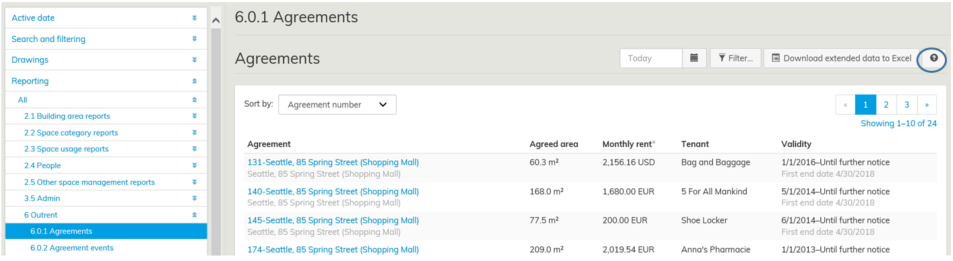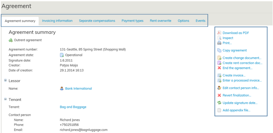 Du kan granska uppgifterna för kommande, gällande och avslutade avtal i det enskilda avtalets basdata samt som sammanfattning i hyresadministrationens rapporter.