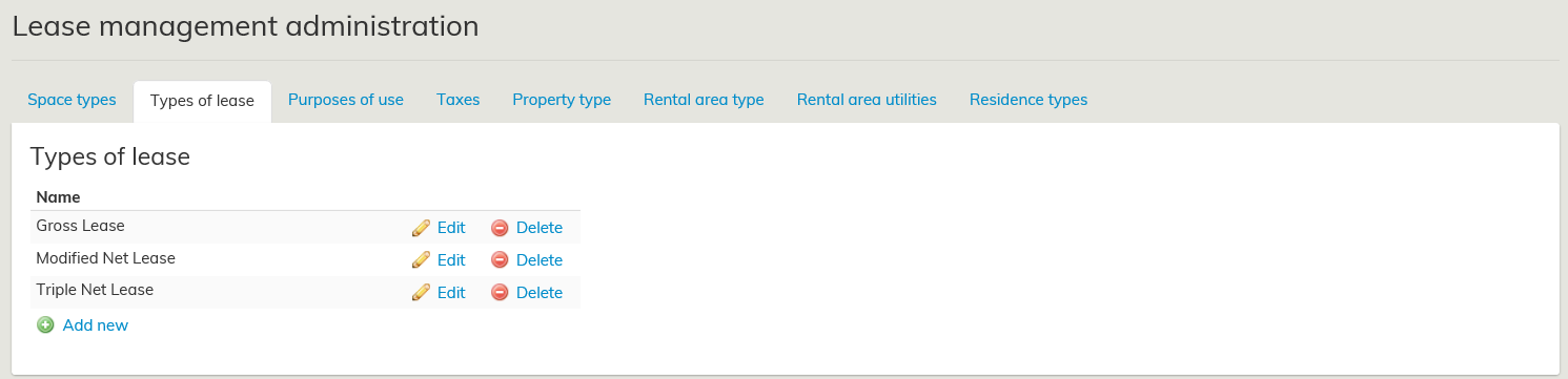 Add a new type of lease by selecting Add new under Types of lease. You can choose whatever name you want for the type of lease. Once finished, select Add new.