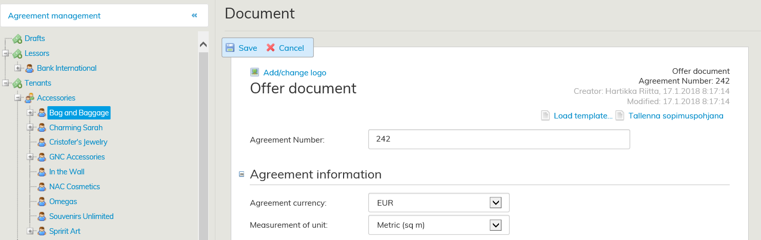 Du kan skapa en offert av uthyrningsområden som du i ett senare skede kan använda som grund till ett avtal. Innehållet i offerten är till stor del detsamma som innehållet i Avtalsblanketten.