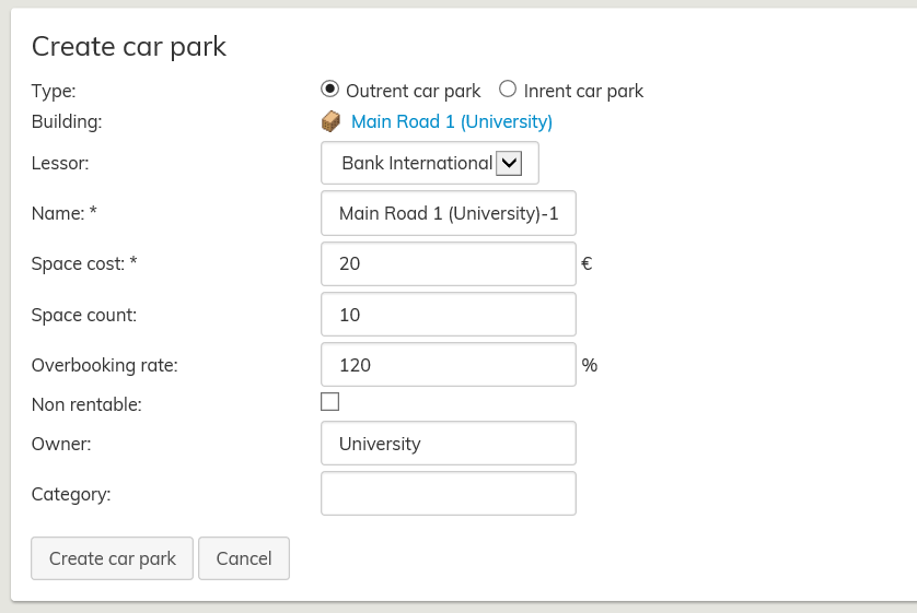 Fill out the required fields to create the car park. Fields that are marked with an asterisk (*) are mandatory.