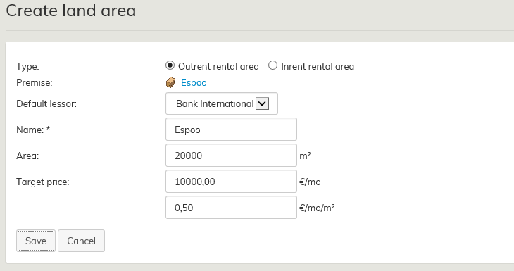 A rentable land area can be created using the Rental area management. From the rental area management, select the level in which you want to create a new land area. Obviously, you can create land areas only for levels higher than the building. It is recommended to specify organization-wide rules that determine under which real estate hierarchy level the land areas should be created. From the right side of the summary page for the selected level, click on Create land area..