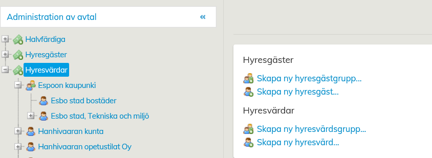 När hyresvärden hör till grupp Esbo stad, sorteras den i vyn Administration av avtal under den ifrågavarande hyresvärdsgruppen.
