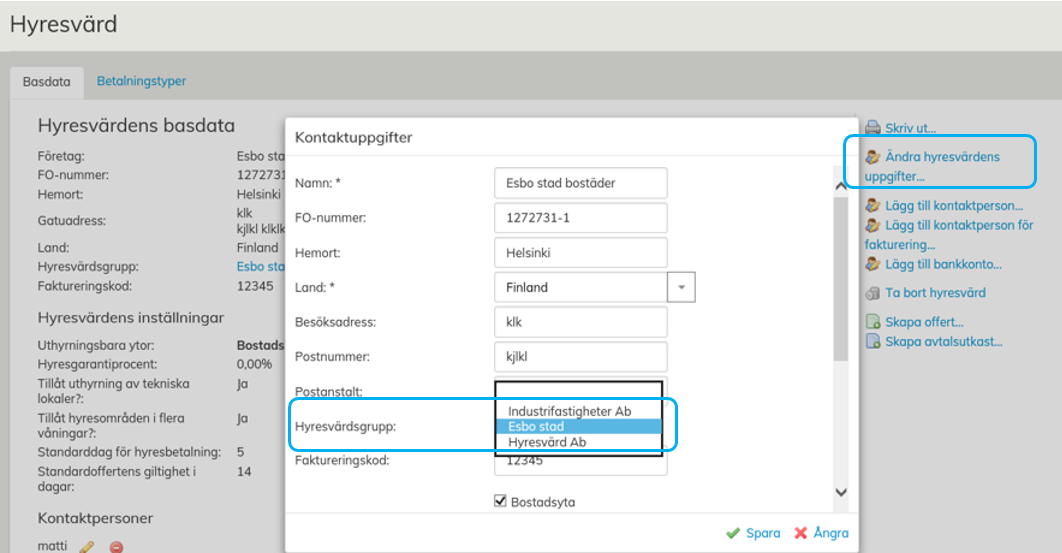 Genom att välja Redigera hyresvärdens uppgifter får du åtkomst till att redigera hyresvärdens uppgifter och där kan du välja önskad grupp för hyresvärden.