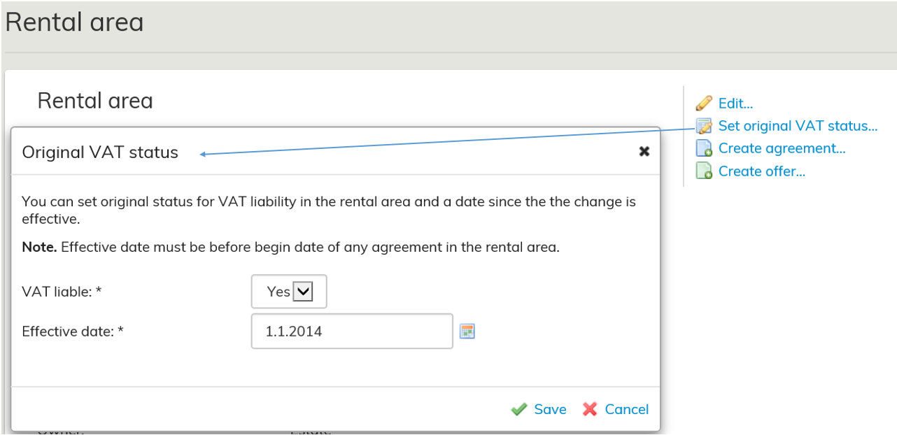 You can determine VAT liability information in the rental area by clicking Set original VAT liability information. The date set must be earlier than the entry into force date of the agreements linked to the rental area.