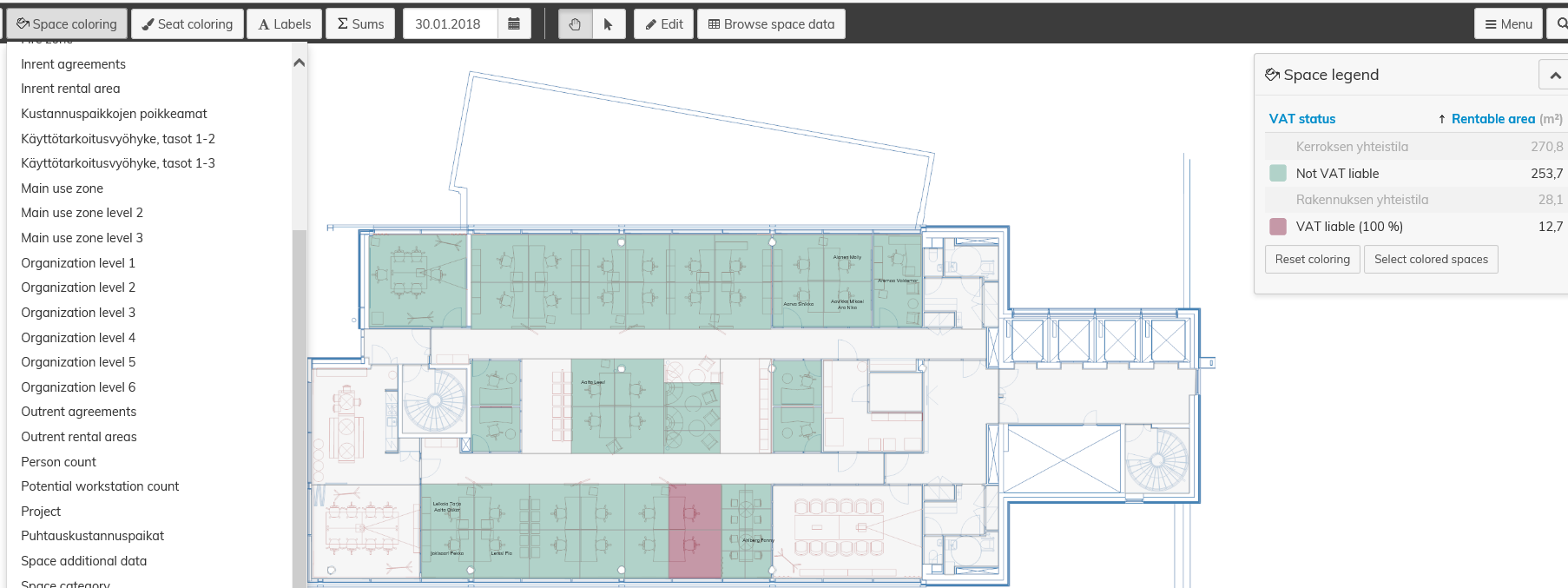 For reviewing the VAT information of spaces, the VAT liability is marked in colors in the floor plan. The coloring shows
