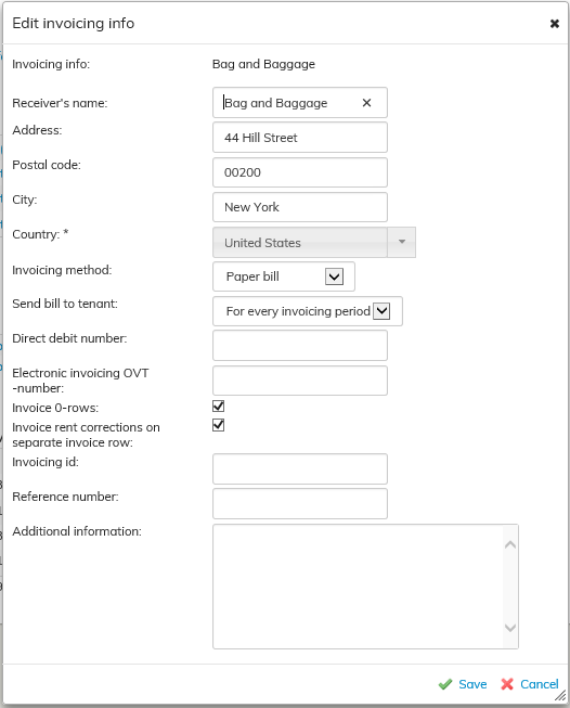You can edit the invoicing information of an existing tenant on the tenant information page under lease management.