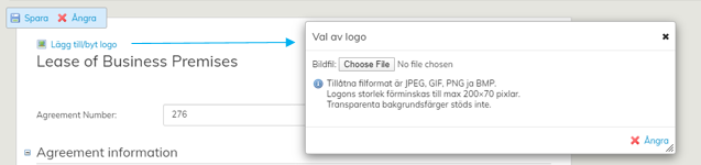 Du kan lägga till din organisations logo på hyresavtalet. Uppe till vänster i avtalet ser du verktyget Lägg till/byt logo. När du klickar på verktyget öppnas ett fönster där du kan bläddra fram önskad logo på sin dator. De tillåtna filtyperna visas i fönstret. Valet av logo påverkar endast detta avtal.