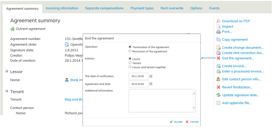 När du har fått meddelande om avtalets avslutande av hyresvärden eller hyresgästen, sök fram avtalet via sökningen eller hämta det i avtalsregistret under kunden eller via Administration av hyresområden från byggnadens samlingsblankett.