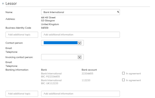If the lessor has several bank accounts entered in their details, select the account(s) to be shown in the agreement by ticking the “In agreement” check box.