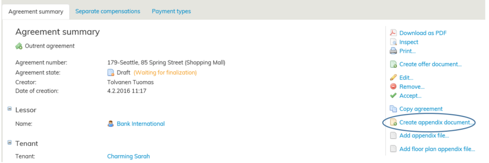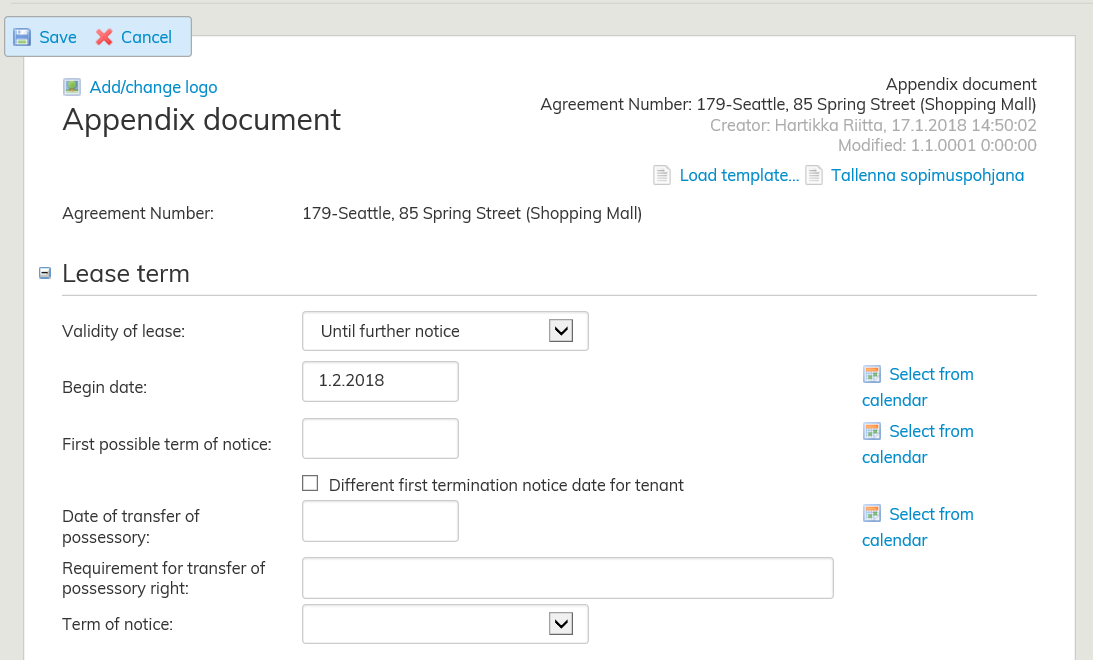 For rental areas which have agreement terms that differ from the main agreement, you need to create an appendix document. In practice, these different agreement terms are usually a different lease term or a different type of rent adjustment.