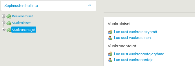Uusi vuokranantajaryhmä luodaan valitsemalla Sopimusten hallinta näkymässä Vuokranantajat tekstiä painamalla saat oikeaan reunaan valinnat.