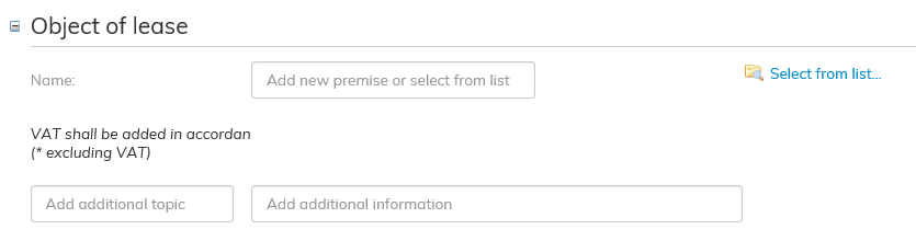 Lägg till det hyresobjekt, som du vill lägga till i hyresavtalet. Klicka på den blåa texten Välj i lista till höger i punkten hyresobjekt.