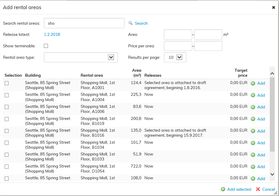 Du kan ange en målhyra för hyresområdet som automatiskt blir avtalets hyra när hyresområdet väljs för avtalet. I avtalet kan hyran ändras så att den avviker från målhyran. Det slutgiltiga avtalet visar den ändrade hyran.