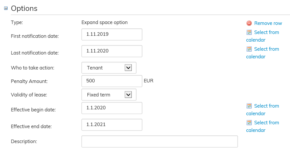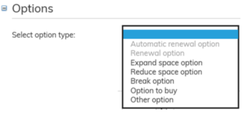 Välj giltighet för förnyelseoptionen i rullgardinsmenyn. Optioner som gäller på viss tid kräver både ett startdatum och ett slutdatum. Optioner som gäller tills vidare behöver ett uppsägningsvillkor. Om uppsägningsvillkoret är en uppsägningstid, ange både hyresgästens och hyresvärdens uppsägningstid.