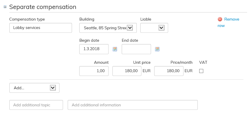 För den separata ersättningen anges en ansvarig part. Om du behandlar ett uthyrningsavtal och väljer hyresvärden som Ansvarig part, beaktas den separata ersättningen inte i faktureringen.
