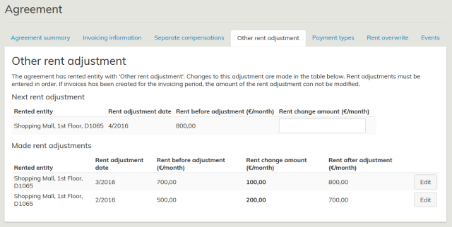 Gjorda hyresjusteringar kan redigeras och tas bort via Redigera.