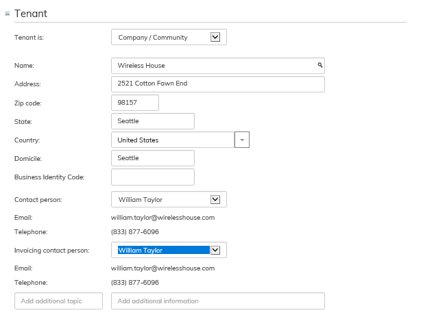 You can select the tenant’s contact person and invoicing contact person from the pull-down menus.