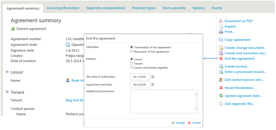 An agreement can be terminated and cancelled by clicking on End the agreement.