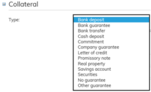 Om en hyresgaranti har kopplats till avtalet, sparas uppgifterna om den här. Välj hyresgarantityp i rullgardinsmenyn.