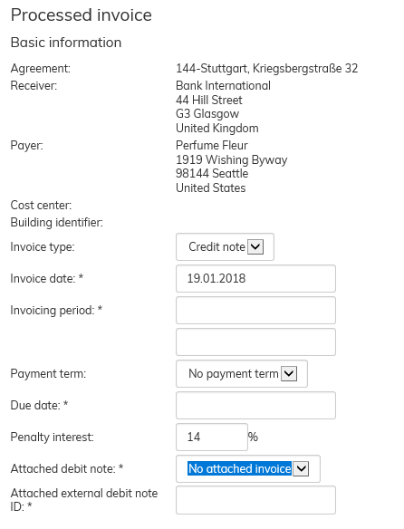 Create invoice and Enter a processed invoice functions can also be used for creating a credit note. In this case, select Credit note from the Invoice type pull-down menu.