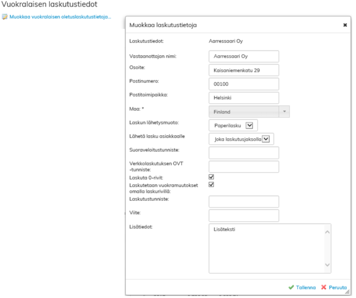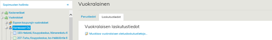Olemassaolevan vuokralaisen laskutustietoja muokataan vuokrauksenhallinnassa vuokralaisen tiedoissa.