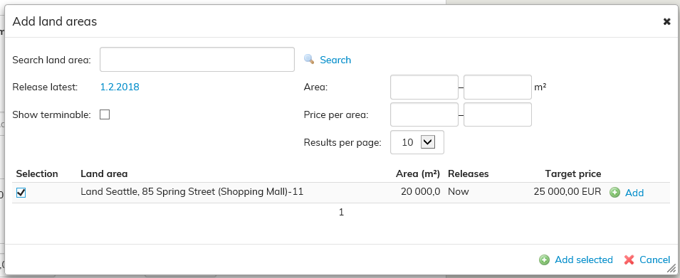 Du kan söka landområden enligt namn, när de blir lediga eller enligt uppsägning. Välj de landområden som ska läggas till och välj Lägg till valda.