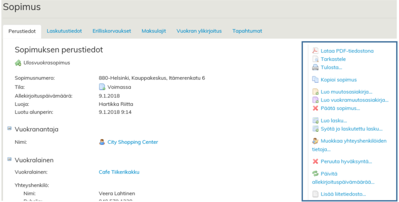 Sopimuksen oikeassa reunassa on painikkeita joiden toiminnasta kerrotaan omilla ohjesivuillaan.