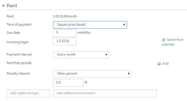 I punkten hyra fastställs uppgifter som gäller hyrans belopp, betalning och fakturering.