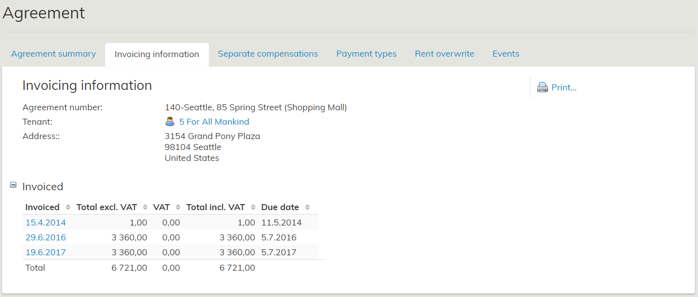 The actual invoicing data for the agreement is gathered under Invoicing information tab.